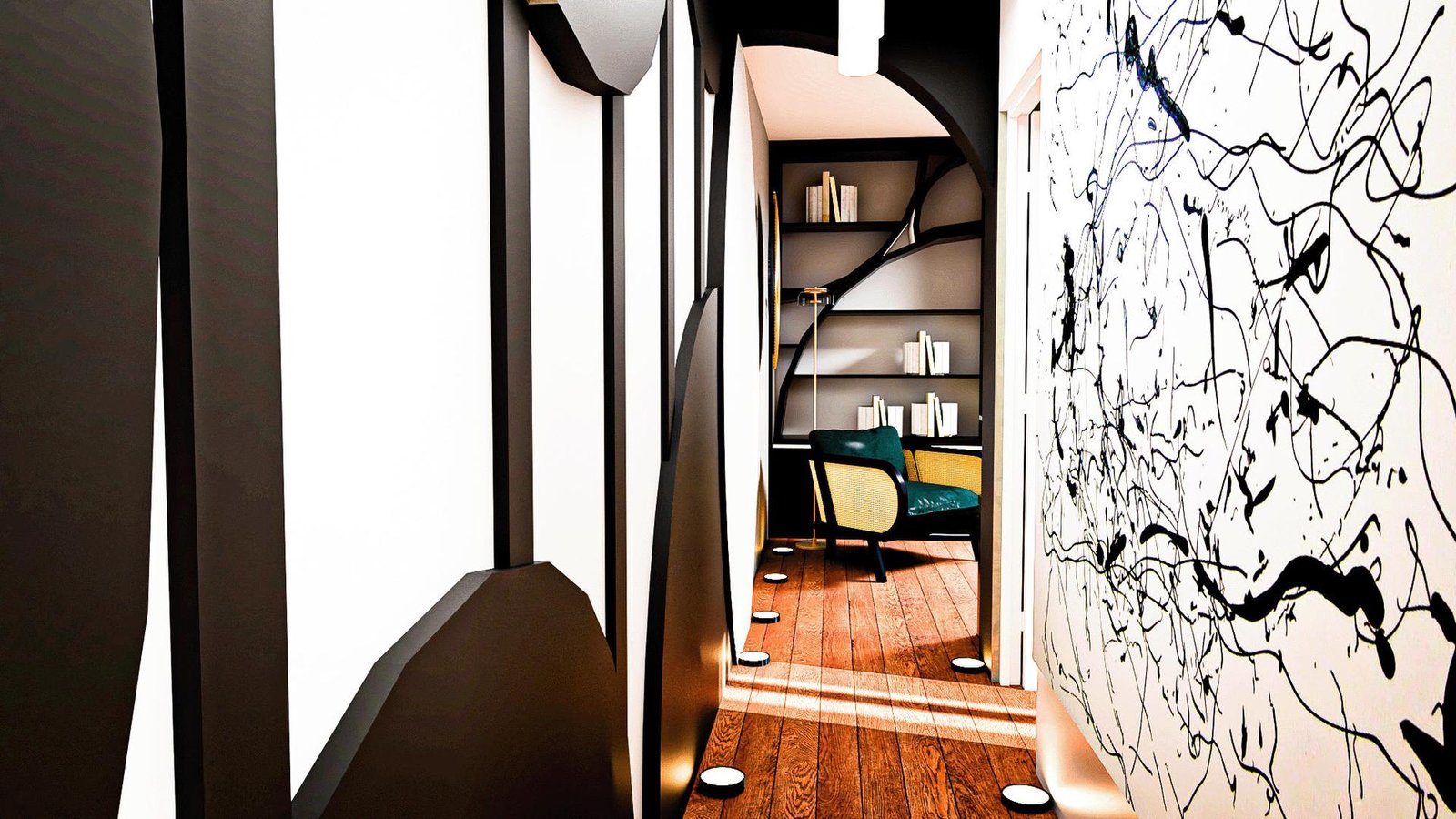 Le contraste noir et blanc structure la perspective du couloir et accompagne naturellement le déplacement. Le passage devient visuellement rythmé et crée une lecture architecturale forte dès l’entrée.