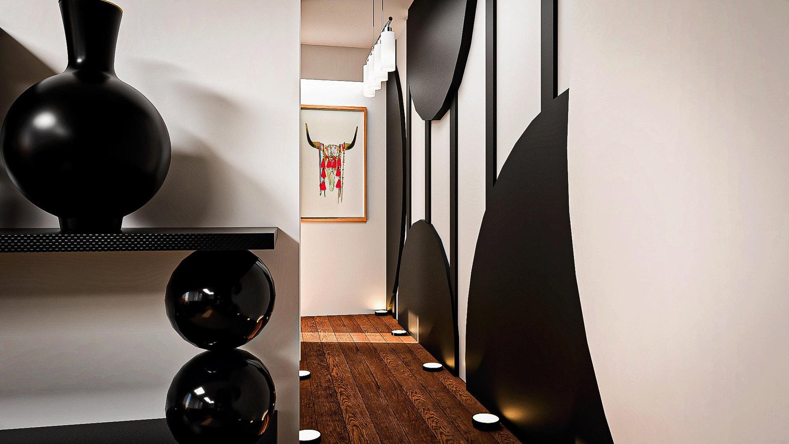 Au fond du couloir, une œuvre graphique d’inspiration bohème introduit une touche de couleur. Elle agit comme un point d’appel visuel et réchauffe l’atmosphère minimaliste, tout en guidant naturellement le regard vers l’espace nuit.