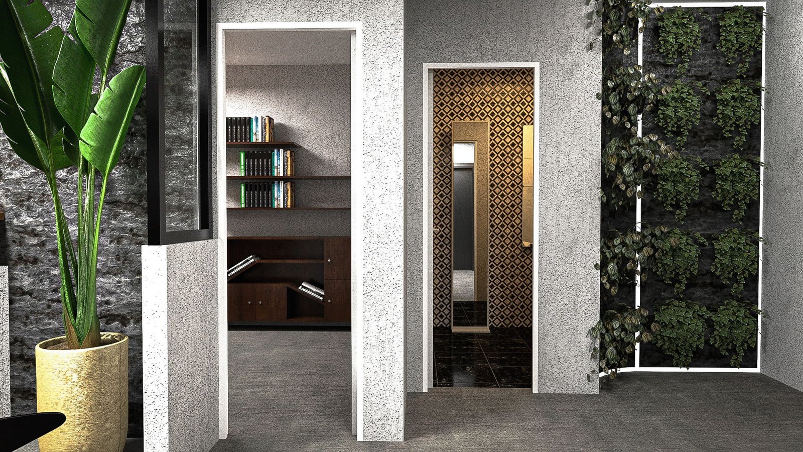 Un miroir horizontal prolonge cet effet, tandis qu’un mur végétal encadré de LED insuffle une touche vivante et contemporaine.