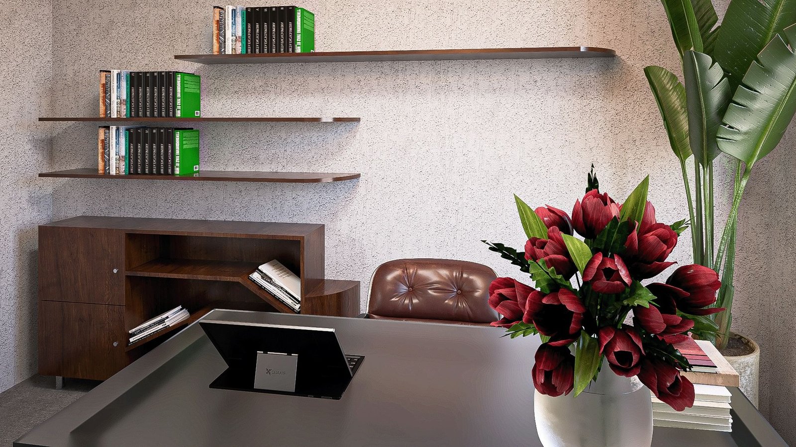 Les bureaux, identiques dans leur composition, associent mobilier minimaliste et matériaux nobles, offrant un cadre propice à la concentration et à l’échange.